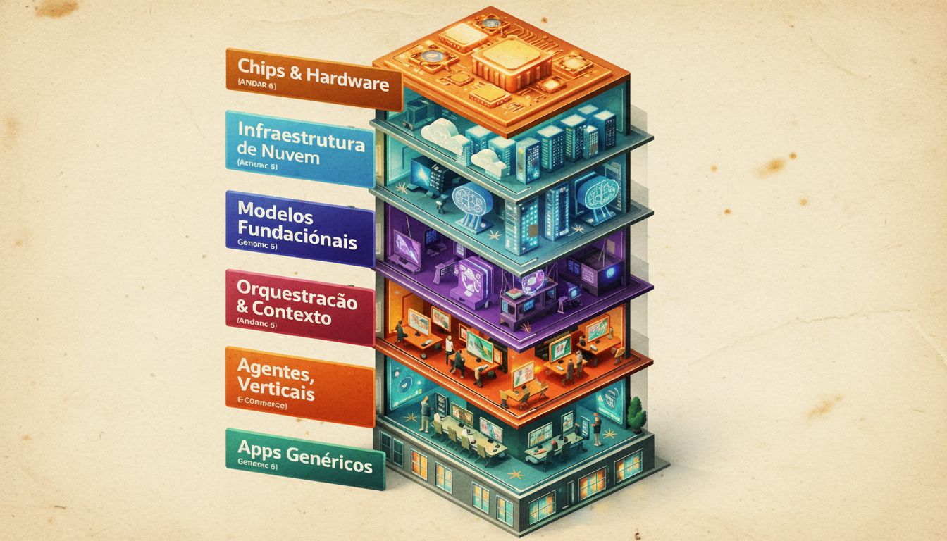 Cada andar é uma camada onde empresas competem. Cada uma tem dinâmicas diferentes de margem, defensabilidade e risco.