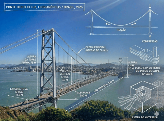 Ele não só criou. Ele pesquisou dados reais da ponte. Vão vertical: 339,473m. Altura das torres: 75m. Largura: 11,5m.